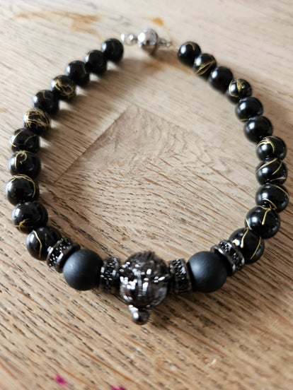 Herrenarmband Schwarz mit Wolfskopf Schwarz Gold Perlen Lava Perlen und kleine abstandsperlen Magnet verschluss ca. 20 cm Unikat